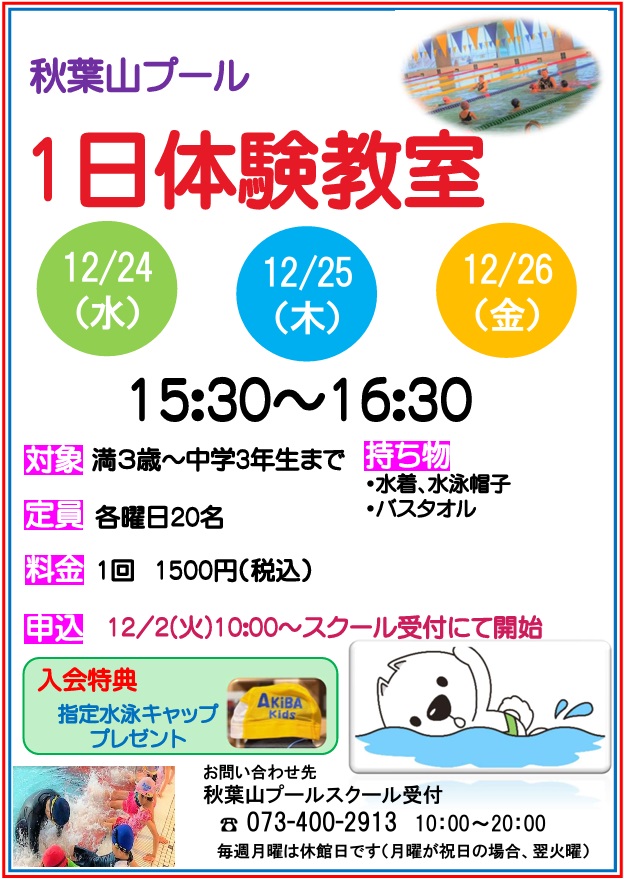 ご希望日をご確認のうえ、秋葉山プールスクール受付までお問合せください。